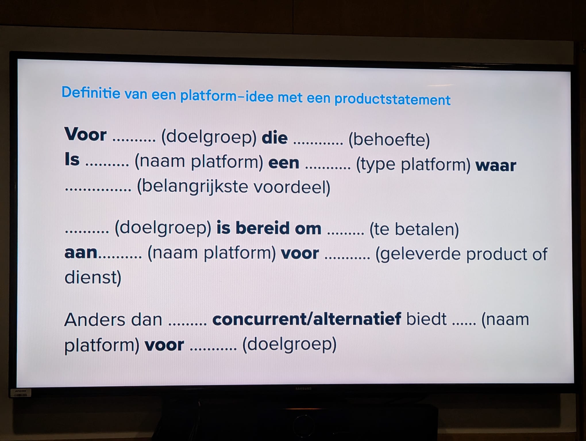 Vraag aan jou: Welke niche of proces in jouw sector zou baat hebben bij een platform? Deel je ideeën in de comments! Zelf ga ik aan de slag met de verkenning van de platform mogelijkheden voor een intern kennisplatform voor docenten op het gebied van onderwijsinnovatie met technologie. Met de oefening van Wout over een product statement heb ik de eerste stappen al gezet (zie afbeelding voor het format)!